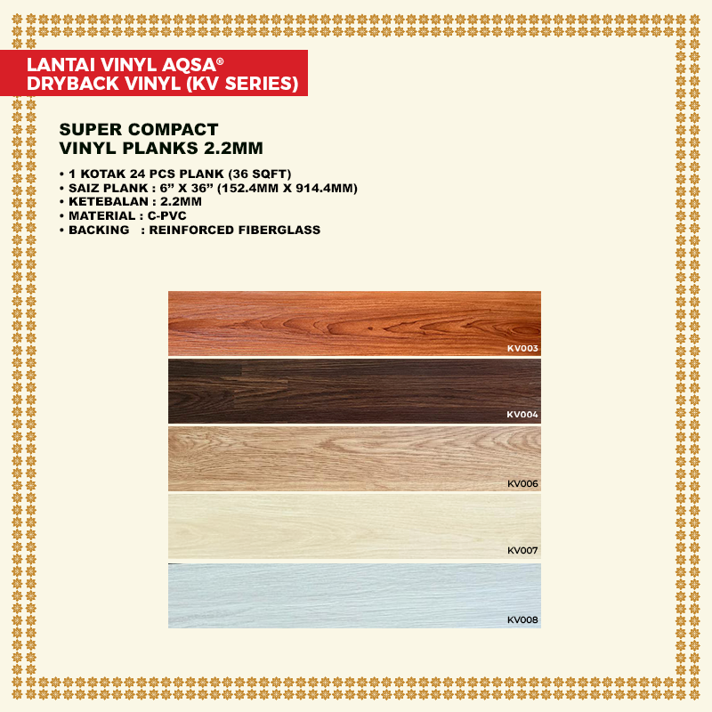Lebar x Panjang + 10% (extra @ wastage) ÷ 36 SQFT Lantai Vinyl Aqsa
